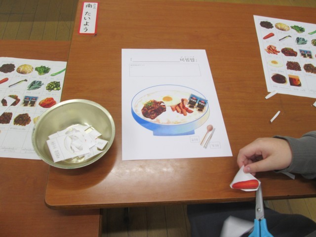 日本のお隣の国、韓国・朝鮮についてゲストティーチャーをお招きして学習をしました。にじの子学級では、オリジナルのピビンパプを作ろうと、好きな具材のハングルを教えてもらって机の上で作りました。とっても素敵なピビンパプが出来上がりました。6年生には、ゲストティーチャーのおじいさんやおばあさん、お父さん、お母さん、そしてご自身のことについてお話してくださいました。誰もが幸せに暮らせる世の中にしていくために、どうしていけばよいのかを考える、とっても大切な学習でした。