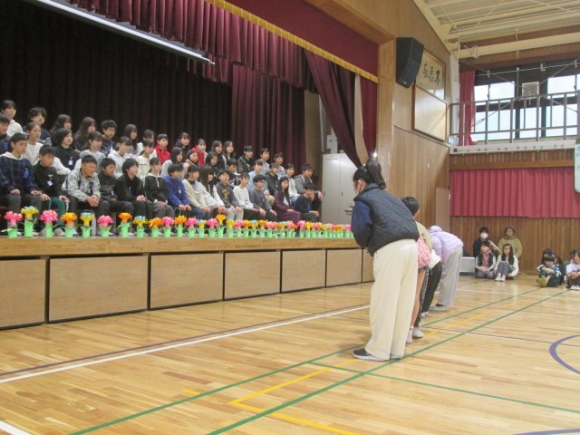 6年生を送る会がありました。いよいよ卒業まであと少しとなり、本当にさみしい気持ちでいっぱいです。まず涙が出てきたのが、6年生の座る姿勢。6年生が入場して舞台をみると、なんとかっこいい座り方。その姿勢に涙が出てきました。早すぎですよね。まずはにじの子学級から。心を込めて作ったお花をプレゼントしました。1年生は言葉と歌の贈り物。手話も一緒に歌う姿に涙が出ました。