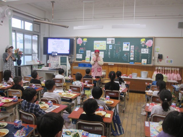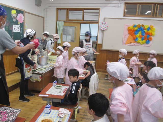 今日から給食が始まりました。1年生にとって初めての給食です。朝から子どもたちは楽しみにしていました。給食当番も初めてだったのですが、一生懸命がんばっていました。準備はとても速かったです。そしていただきます。中には苦手な食材がある子どもももいたとは思いますが、全員残さずに食べることができました。それもしっかり食べて、時間内に余裕をもってごちそうさまができました。初日は花丸の1年生です。