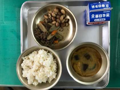 献立はご飯、とら豆の甘煮、牛肉とごぼうの煮つけ、なすの味噌汁、牛乳でした。