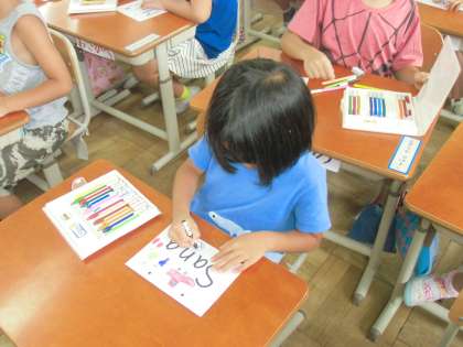 そして次は,自分の名前カードに,好きな動物や食べ物の絵を描きます。一人一人の子どもたちが,英語であいさつをしながらカードを受け取り,素敵な絵を描きました。