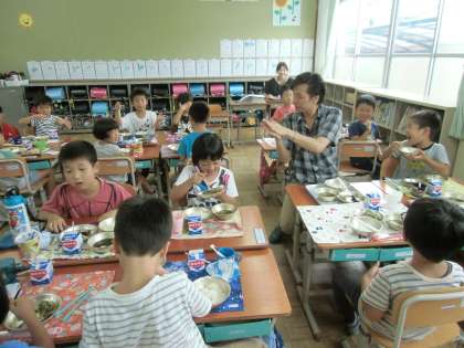 その後の給食時間も,テオドア先生と一緒に給食をいただきました。子どもたちは,聞きたいことを次々と質問していました。