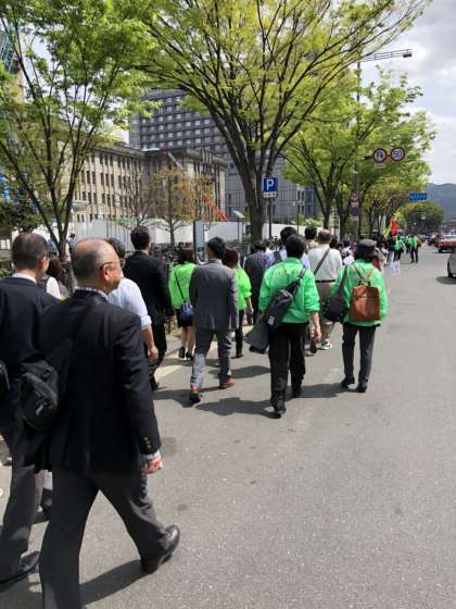 本校からは,酒井PTA会長と校長が手にプラカードを持ち,御池中学校をスタートして四条河原町まで行進しました。