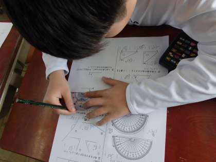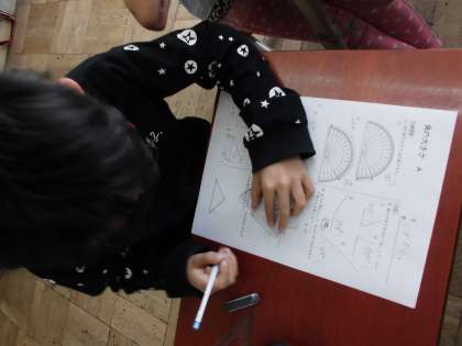 算数の「角とその大きさ」の学習が終わりました。目盛りの読み方がわからず,逆向きに使っていたこともある最初にくらべ,今では角度をはかるのがあっという間です。問題に取り組むときは,分度器がずれないように,慎重にあてています。子どもたちの様子をみていると,180°以上の角に苦戦しているようで,何度も教科書やプリントで練習しました。180°に足して計算するのか,360°から引くのか…。角の大きさを見極めながら真剣に取り組んでいました。