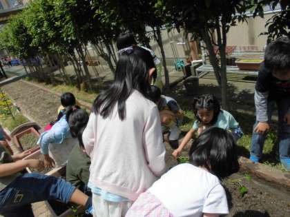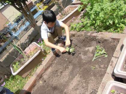 生活科の学習で野菜を植えました。鉢には,ミニトマト,枝豆,トウガラシ,ピーマン,オクラから子どもたちが育てたい野菜を1つ植えました。また花壇では,さつまいもを植えました。翌日から,子どもたちが一生懸命水をやっている姿がみられました。おいしくいただけるように育てていきたいです。