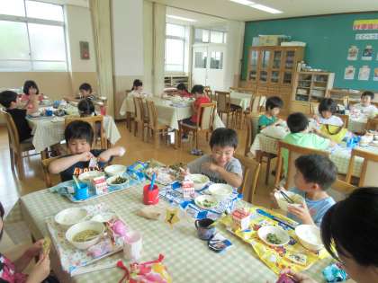 「いただきます!」元気にごあいさつをした後,子どもたちは,グループの仲間と楽しく談笑しながら給食を味わいました。