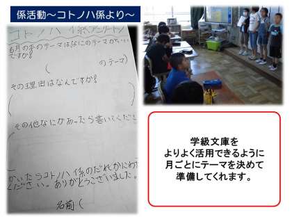 学級文庫をよりよいものにしようと『コトノハ係』の子どもたちが自発的に活動に取り組んでいます。アンケートでクラスのリクエスト調査を取りながら,希望のテーマに沿って本をそろえようとしてくれています。このように『学級のために』率先して活動している係が多く,とても頼もしく感じています。係活動が学級にとどまらず,視野を学校全体にまで広がると,もっといいですね。