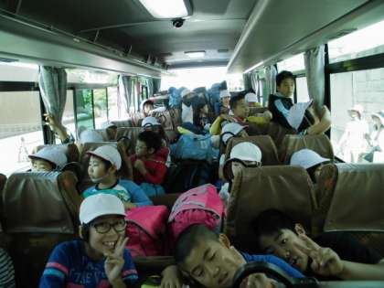 山の家に向かって出発です。みんな元気がみなぎっています。いつ間にか、校歌のふしが聞こえてきたと思ったら、みんなで一斉に歌いだしました。終わったら次はビリーブです。何曲か歌うと、ジャンケンゲームやクイズが始まりだしました。花背峠に近づくと、曲がりくねったコースに体を揺らしながらジェットコースターのように楽しんでいました。