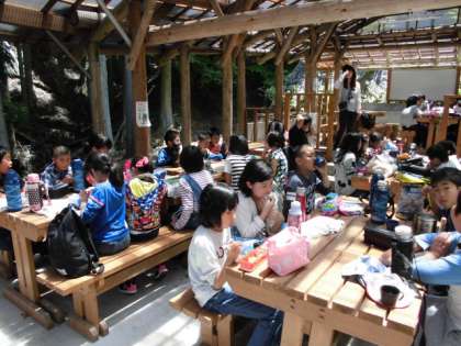 初日の昼食はお弁当です。お家で作っていただいたお弁当に舌鼓です。みんなで食べるといつもよりおいしく感じました。この後、ロッジに戻って荷物の整理をし、午後から竹ばし作りと野外炊事です。