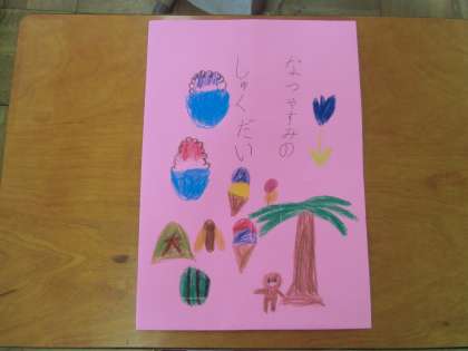 はじめに,画用紙を折って,のりで貼り,袋の形を作りました。次に,「なつやすみのしゅくだい」というタイトルや自分の名前を,丁寧に書きました。最後は,お気に入りの絵や模様を袋に描きます。子どもたちは,「夏」に関係のある絵を描いたり,大好きな動物を描いたりしていました。世界に一つだけの,素晴らしい袋が出来上がりました。