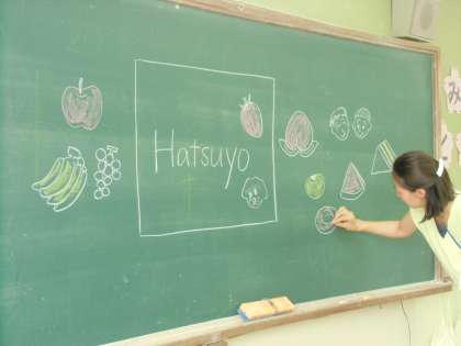 最後に,名前カードを見せながら自己紹介をし合う活動をしました。「こんにちは。」「わたしの名前は○○です。」「わたしは○○が好きです。」「さようなら。」