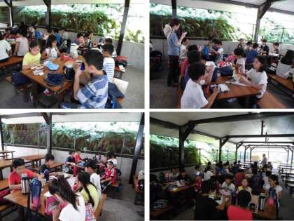 昼食のお弁当です。今日は朝が早かったので、みんなお腹がぺこぺこです。15分ほどで平らげました。この後、プレイホールで仁和小学校との合同入所式です。