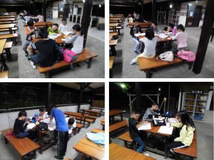 午後7時半よりナイトゲームをしました。山の砦まで言葉のメッセージを探しにいくのですが、途中で一つ目の大男ダイダイラボッチに見つかるとさらわれてしまいます。みんなで協力して夜道を歩いたのですが、さすがに怖くて泣き出す児童もいました。