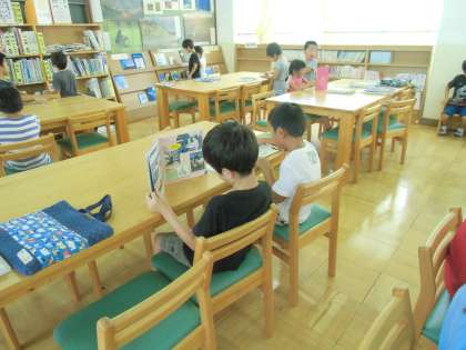 はじめに,図書館にあるたくさんの本の中から,夏休みに読みたい本を借りました。「この本,面白そう!」「どちらの本を借りようかな?」子どもたちは,ワクワクしながら,本を探していました。