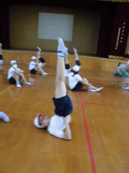 水泳の学習も終わり,体育の学習ではこれから運動会に向けて組体操の練習に取り組んでいきます。今回は第1回目ということで,V字バランス・十字バランス・肩倒立・ブリッジといった一人技を中心に技の練習に取り組みました。簡単そうに見えた技でも,実際やってみるととても難しく,その姿勢を保ったり,指先から足先,頭の先までしっかりと伸ばしてより美しく見せたりすることの難しさを痛感した1時間となりました。いよいよ夏休みに突入します。この期間での一人一人のがんばりがどのように演技へとつながっていくのかが見ものです。