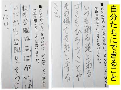 自分たちも今,委員会活動や係活動を通して,「学校のために」できることに取り組んでいます。この道徳の学習を通して,「地域のために」できることを考えるよいきっかけとなりました。いつも遊ぶ大好きな公園を,自分たちの手でもきれいにしていけたら,またすてきな『大将軍の町』になっていくことだと思います。