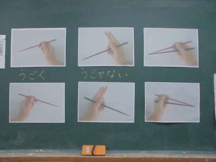 今年度二回目の食の学習は「お箸」について学習しました。まず,お箸には,「まぜる」,「つまむ」,「切る」など色々な用途があることを知り,その後,お箸の正しい持ち方を確認しました。さらに,付箋をつまむ練習をしました。ほとんどの子どもたちが,普段から正しい持ち方ができておりとても器用に付箋をつまんでいました。