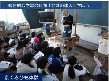 総合的な学習の時間の取組で『地域の達人に学ぼう』という学習を進めてきました。今回は,京組紐の伝統工芸師である長谷川さんをお招きし,実際に組紐をつくる体験をしたり組紐についてのお話を聞いたりしました。