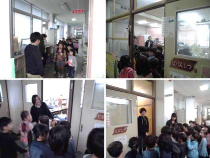 職員室や保健室,印刷室や事務室などを見学し,担当の教職員と挨拶をしました。他にもたくさんの教室がありますが,これから学習をして,2年生と一緒に探検をします。