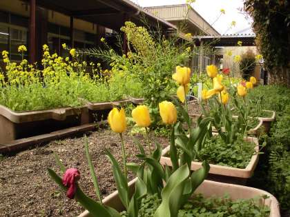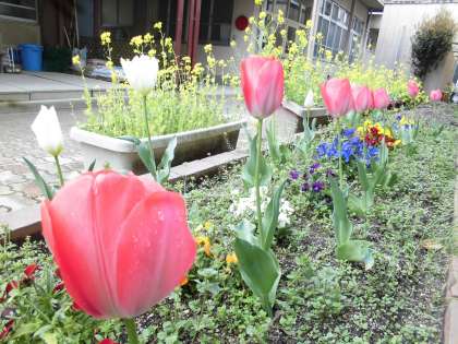 教室横の花壇のチューリップが咲き誇り子供たちを見守っています。