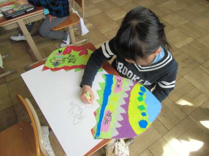 子どもたちは,自分だけのひみつのたまごを想像し,その中からどんなものが飛び出すのかを考えて,熱心に描いていました。
