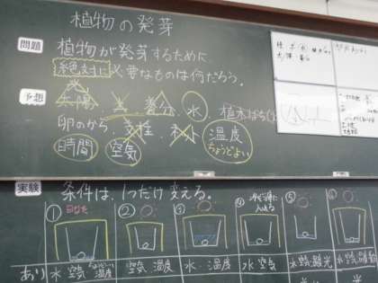 5年生は理科の学習で,植物の発芽に必要な条件に付いて予想を立てました。そして,その予想を確かめるためにはどんな実験をすればよいかをグループで相談しました。