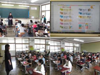 今日は新学年になって初めての外国語科です。今年の5年の外国語科は,担任ではなく少人数担当の先生が主になって1年を通して指導します。そして,授業は担任の先生やALTの先生とペアになって進めていきます。