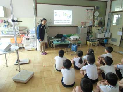 身体計測は,身長と体重を測定しました。子どもたちは,少しずつ大きくなる自分の体に関心をもち,成長を楽しみにしているようでした。