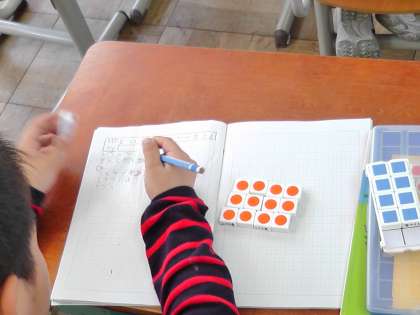 1つずつ分けていく方法,2つずつ分けて4個にする方法,4つずつ分けていく方法などさまざまな考えが出ました。数図ブロックで確かめたり,ノートに図を描いて考えたりと「12÷3」の意味をしっかり考えた1時間となりました。