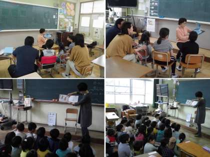ボランティアさんが来られる日には,児童は休み時間の終わる少し前に教室に戻り,机を後ろにまとめて広いスペースを作ります。そして,小さな絵本の挿絵をみんなでのぞき込みながらお話の世界にとっぷりと浸ります。