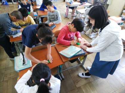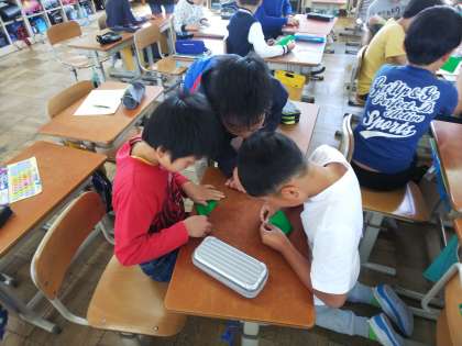 6年生が修学旅行で北淡震災記念公園にある野島断層保存館に行きます。そこに持って行く千羽鶴を折るのに,6年生が中間休みに折り方を教えに来てくれました。