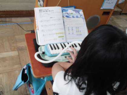 音楽科では,音を選んで簡単な旋律を作りました。「山を登ったり下りたりする感じがする。」「イルカがジャンプしている楽しい雰囲気が表れるように作ってみた。」など子どもたちの思いがつまった学習となりました。できた旋律はけんばんハーモニカで吹いて楽しみました。