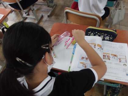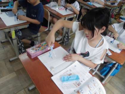 算数科の学習でコンパスを使っています。今日は,コンパスを使って円をきれいにかくことを課題として取り組みました。コンパスの使い方を確認してから行いました。初めて使うコンパスはなかなか難しくみんな苦戦していました。「手首を少しひねると描きやすい」ということや「少し傾けるとよい」ということなどコツも見つけていました。途中で途切れたり二重になったりすることなく,きれいな円をかくことができるよう何度も練習しました。