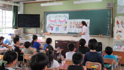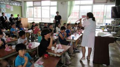 歯みがきの大切さのお話を聞いた後,正しい歯みがきの仕方を実際に磨きながら教えていただきました。毎日,給食の後に音楽を聴きながらしっかりと歯みがきをしているので,上手に歯みがきできていることを歯科衛生士さんにほめていただきました。これからも正しい歯みがきを続けていきましょう。