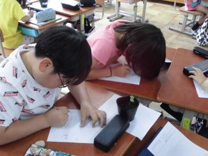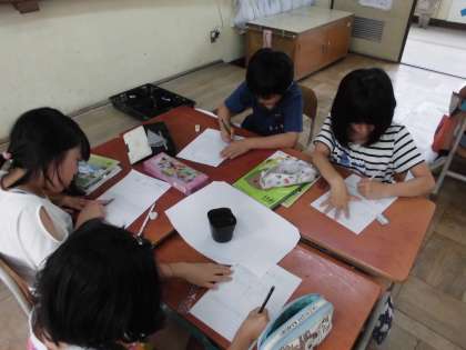 理科の学習でホウセンカの子葉の観察をしました。よく見て,色や形,大きさ,高さなどくわしく観察しました。子葉は2枚であることや葉に線があること,細かい毛があること,くきの色が上や下などの部分によって異なることなど,たくさん気づいていました。「あんなに小さな種から出てきたのだな。」という声も聞こえていました。