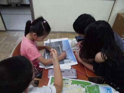 社会科の学習で京都市のまちの様子について調べています。今日は,各班に京都市内各地の写真を渡し,写真から分かることを友だちと一緒に見つけました。また,京都市の絵地図を見て,写真の場所がどこなのか考えたり,さらに,絵地図から分かることも考えました。班の友だちと一緒に学習した後は,全体での交流です。相手意識をもち,自分たちが見つけたことや考えたことを一生懸命伝える姿がたくさん見られました。