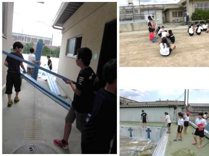 来週からの低学年の水遊びに向けて,毎年,高学年の5・6年生がプールやプールサイド,更衣室などの清掃を行います。1年分の汚れを落とすのは大変ですが,頑張った分,プールが美しくなるので達成感は大きいです。水がかかったり服が濡れたりするのもいとわずにみんな頑張って掃除に励みました。