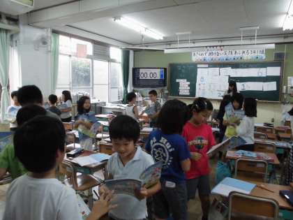 外国語活動で,数の尋ね方や答え方について学んでいます。1〜20までの数字を英語で言うことも上手になってきました。リズムにのって,楽しく歌って数の数え方に慣れ親しんでいます。今日は,後半に数を尋ねる活動もしました。お隣の友だちとペアになったり,教室を歩き回って友だちと声をかけ合ってペアをつくって活動したり,とても楽しそうです。