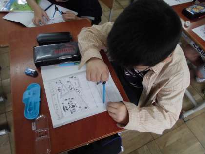 また,理科の学習では,風やゴムの力でものを動かすことについて学び始めました。車のセットを使って学習しています。今日は,的の中に車を入れるにはどうすればよいか考え,実験しました。理科の学習では,予想,実験,考察,まとめという学習の流れを大切にして進めています。