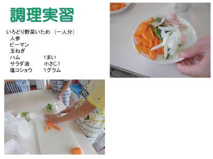 「朝食に,手軽にもう一品」をテーマにいろどり野菜炒めを作りました。野菜を手早く切る様子やフライパンを器用に動かしながら炒める様子が見られました。最後に,塩コショウで味付けしおいしくいただきました。