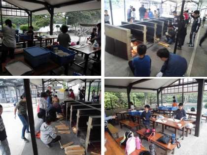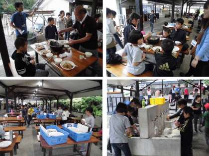 みんなで手分けして材料を切り,かまど係はかまどに火を起こしました。味付けは砂糖と醤油でシンプルです。しばらくすると,牛肉の甘い香りが漂ってきました。みんなで作った料理は特別です。何杯もおかわりする人もいて,ほとんどのグループが完食しました。