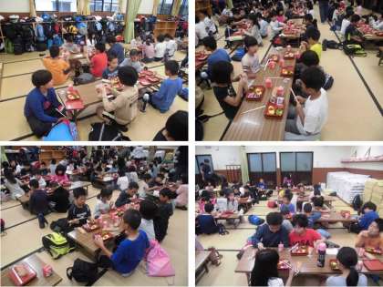 予定では野外炊事場でいただくことになっていましたが,風が強く,90畳の部屋で仁和校と一緒にいただくことにしました。