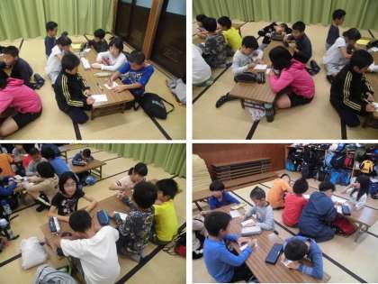 午前中はかわりのプログラムで家族あてにはがきを書きます。食事をとった90畳です。隣では仁和校が活動しています。仁和校の磯観察も中止になりました。