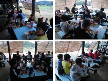 お天気は回復しましたが,低気圧でしょうか?さえぎるものがないため海から突風が吹いてきます。みんなお弁当のふたをおさえながら,時に茶碗をひっくりかえしながらいただきました。メインはエビフライとから揚げです。わかめと豆腐の温かい味噌汁付きです。