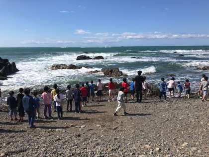 昨日はあいにくの荒れ模様だった天気がうそのように澄み渡る青空です。朝ごはんを食べたあと,昨日残念ながら行けなかった海岸へ行くことができました。力強く波打つ様子を友だちと一緒に観察したり,浜辺にある小石の形に興味をもって宝探しをしたりしていました。昨日の海と今日の海を比べながら,自然のすごさを感じることができました。