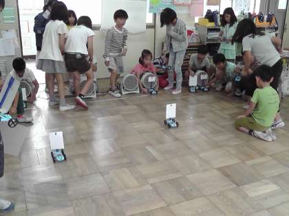 理科「ゴムや風でものをうごかそう」の学習をしています。ゴムの力について学習した後は,風の力です。弱い風と強い風,風の強さによってうごきがどのように変わるのか実験しました。また,風受けを大きくするのか小さくするのか風受けの大きさによるうごきの変化も実験しました。子どもたちは,この学習が大好きです。いつも目を輝かせて実験しています。