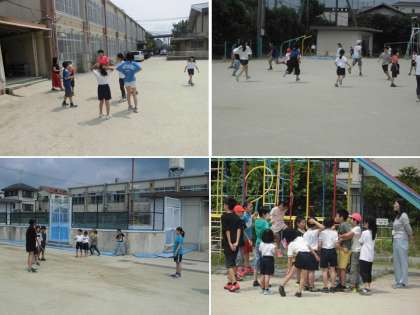 先日,6年生のリーダーを中心に,どんな遊びをしたいかを話し合いました。そして,それぞれの場所でみんなで遊びます。5・6年生のリーダー・サブリーダーは,自分たちが楽しむのではなく,グループみんなが楽しめるように,特に小さな学年の子ども達に配慮しながら種目を決めました。