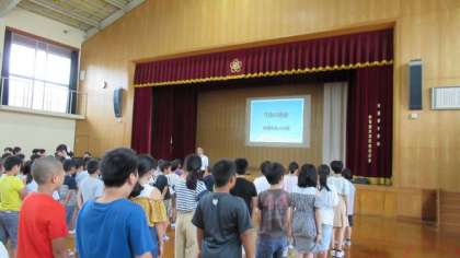 7月の朝会がありました。校長先生からは,地域の川でホタルを見ることができることから,これからも美しい環境を守っていこうというお話でした。そして6月の環境月間を振り返り,電気のつけっぱなしや水の出しっぱなしを無くしていきましょうと,みんなで気を付けていく目標を立てました。