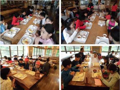 トレーを持って自分の食べたい料理を盛っていきます。パンしかないと思っていたのが、後からご飯があると気づいて両方いただく子どももいました。これから山登りなので、しっかり栄養を補給しました。