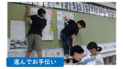 放課後,4年生の教室で見られた素敵な光景です。総合的な学習の時間に作成した新聞を,自分たちから進んで掲示のお手伝いに取り組んでしました。「あっち持って。」「はい,どうぞ。」と友達と協力しな取り組む姿が素敵でした。みんなのために,先生のために行動できる4年生でした。